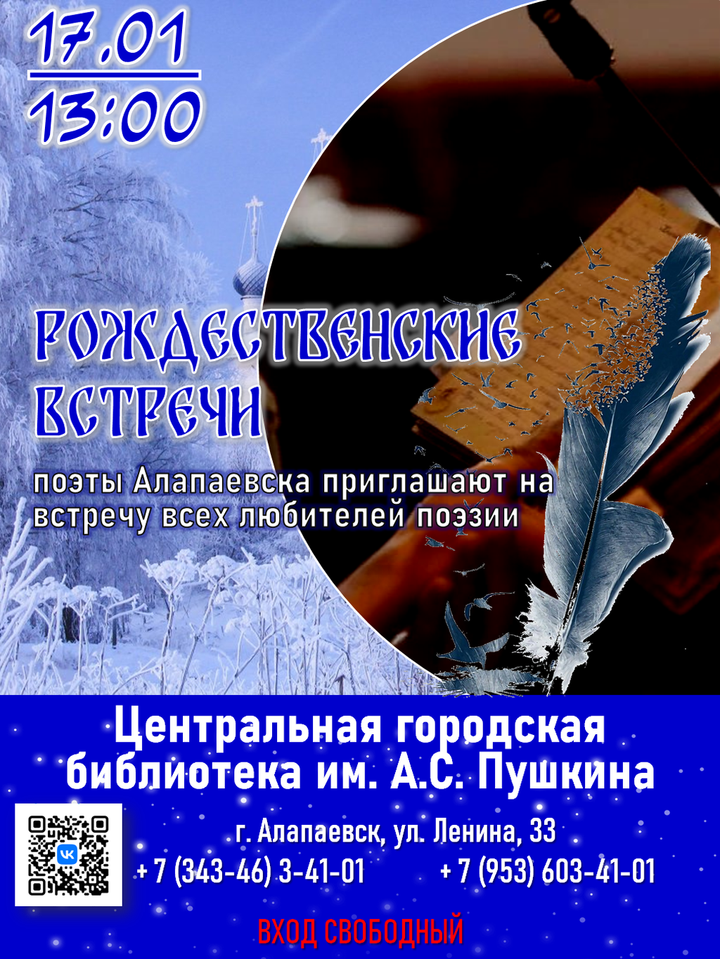 Приглашаем всех ценителей поэзии 17 января в 13:00 в Центральную городскую библиотеку им. А.С. Пушкина на "Рождественские встречи". Уютная атмосфера библиотеки, звучащие стихи о зиме, надежде, любви — всё это ждёт вас.