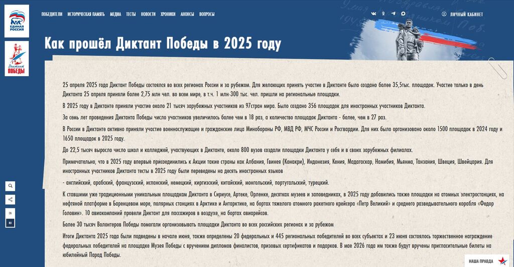 На сайте международной акции «Диктант Победы» доступны подготовительные тесты.